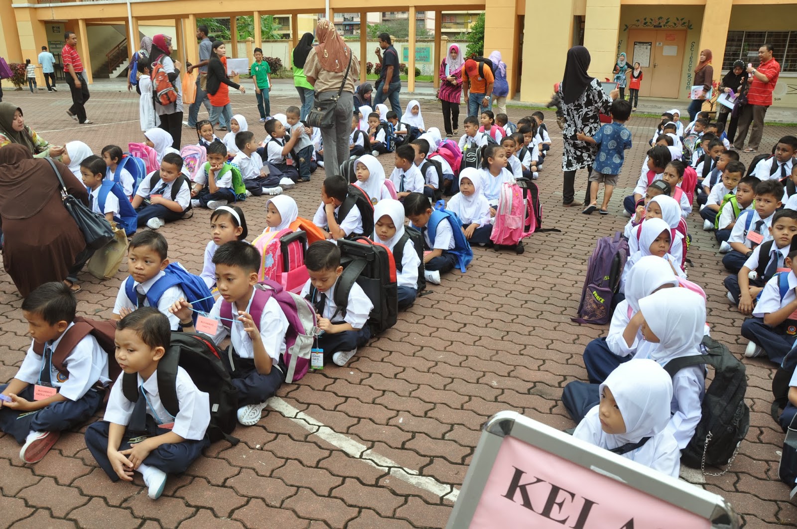 Murid-murid tahun 1 dikumpulkan sebelum masuk ke kelas untuk ujian |